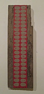 Ana Mendieta's work stands out because she involved herself, specifically her own body in filmed performances in which her naked form is seen , here emerging from under stones and earth, or the space where it has been, set alight with bright flames, or left as an impression. A book available to read in the gallery is helpful in telling her story and explaining her wish to somehow enact personal rituals to be in touch with Mother Earth as if longing for a prehistoric awareness of it. It's intensely romantic to my mind, and as she died in a tragic accident at a young age the story of that incident and her husband, artist Carl Andre being accused of murder and acquitted, the vivid tragedy threatens to impede serious consideration of her art. However in this show it is the most attention grabbing and dramatic piece and nicely shown with a comfortable and beautifully crafted wooden seat opposite the three small screens. Also helpfully the time of the video is given so you know how long you might take to receive the images, which are only about three minutes and seen simultaneously.